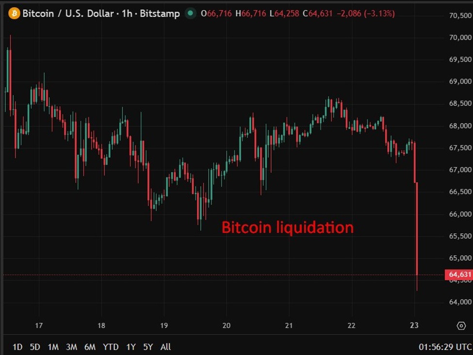 Bitcoin. Not just this though, ETH down 4.5% also, whole crypto complex getting hit. Daily chart looks headed back to the lows: