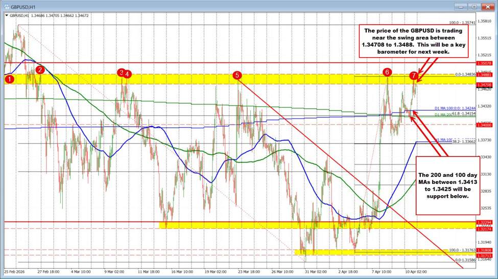 The GBPUSD is heading into the close trading near the lower end of a well-defined swing-area ceiling between 1.34708 and 1.3488 (see red numbered circles on the chart below). This zone has repeatedly capped upside attempts over the past six or so weeks, making it a key barometer for buyer conviction. Each test has attracted sellers, but the fact that the pair is once again pressing into the lower bound of that range suggests buyers are not backing down. If the price can build momentum and extend above the top of this ceiling area, it would signal a meaningful shift in control, opening the door for a broader upside extension as trapped shorts are forced to cover and momentum traders re-engage.On the downside, the 100- and 200-day moving averagesβ€”clustered between 1.3414 and 1.3424β€”serve as a critical support zone. This area represents a classic β€œline in the sand” where buyers have recently leaned to defend the broader bullish bias. A move below that cluster would not only break a key technical floor but also tilt the short-term bias back in favor of the sellers, likely leading to increased downside probing as confidence in the bullish structure erodes.Bottom line: The battle lines are clearly drawn. Resistance above at 1.34708–1.3488 defines the upside breakout zone, while support below at the 100- and 200-day moving averages defines the risk for buyers. With price squeezed between these levels, the pair is coiling into the close, and the next directional move will likely be driven by weekend headlines and how traders respond in the early hours of Monday trading.