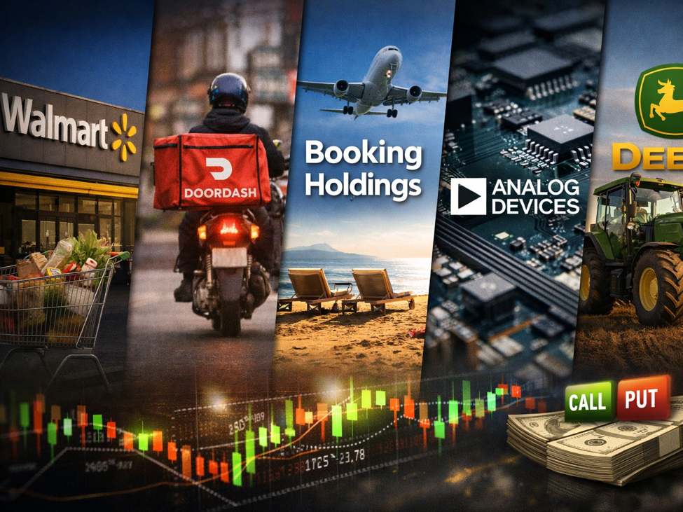 There are earnings weeks where volatility is isolated. And then there are weeks where positioning across multiple sectors is already stretched, and earnings become the release valve.This one feels like the latter.Walmart, DoorDash, Booking Holdings, Analog Devices, and Deere do not share business models. What they share right now is elevated options pricing and a seat inside active sector rotation flows. That combination matters more than the individual EPS lines.Start with the volatility backdrop.Implied moves across this group are running above typical ranges. DoorDash is carrying particularly wide expectations into the print, reflecting uncertainty around consumer behavior and margin durability. Booking’s implied move, while smaller in percentage terms, is still meaningful for a mega-cap travel name. Walmart, Analog Devices, and Deere are also pricing reactions that exceed routine quarterly adjustments.That tells you one thing clearly: markets are not positioned for a non-event.But volatility alone does not create opportunity. Positioning does.DoorDash is a growth-sensitive, sentiment-driven name. If results show improving unit economics or stronger-than-feared demand, and the stock breaks beyond the implied move range and holds, that would suggest dealers and short-term traders are forced to adjust. In that case, follow-through matters more than the headline beat. If the stock spikes and fades back inside its implied band within a day or two, the move was likely volatility premium unwinding rather than fresh conviction.Booking sits in a different lane. Travel demand has remained resilient, but it is not immune to macro pressure. Commentary around forward bookings, regional strength, and pricing power will likely drive the reaction more than the trailing numbers. If Booking can hold strength post-print, it supports the idea that discretionary travel remains durable. If it rolls over despite a solid report, that suggests positioning was already leaning long.Walmart is the defensive pivot.Capital has rotated toward staples and lower-beta exposure in recent months. Walmart often acts as a proxy for that flow. A strong report that sustains upside would validate defensive positioning. A disappointment, especially one tied to margin pressure or consumer strain, could unwind part of the staples trade. In that scenario, the reaction would likely extend beyond the stock itself.Analog Devices offers a read on the semiconductor and industrial demand cycle. The key question is inventory normalization. If management signals stabilization and improved visibility, the stock may benefit not just individually but through sympathy across the sector. If demand softness persists in guidance, semiconductors could see broader pressure.Deere provides insight into capital goods and agricultural spending. Its commentary touches financing conditions, equipment demand, and rural economic strength. A constructive outlook would support the industrial rotation thesis. A cautious tone tied to financing costs or commodity softness could reinforce defensive capital allocation.Underneath all of this sits the skew.Implied moves tell you magnitude. Skew tells you bias.If options markets are leaning toward downside hedging and results contradict that expectation, upside moves can extend beyond what the raw implied range suggests. The reverse is also true. Heavy upside positioning paired with cautious guidance can create abrupt downside air pockets.The more important observation is structural.If several of these names break beyond their implied ranges and sustain direction with sector ETF confirmation, that signals real capital movement. If reactions fade quickly across the board, it signals positioning reset rather than narrative shift.This cluster of earnings is less about five individual companies and more about testing current capital allocation themes:Is the consumer strong enough to justify discretionary risk?Are defensives too crowded?Is industrial demand stabilizing?Are semiconductors ready to reaccelerate?The answers will not be found in the first fifteen minutes after the release. They will show up in whether price holds, extends, or reverts once volatility collapses.That is where the signal lives, live it with investingLive.com Stocks