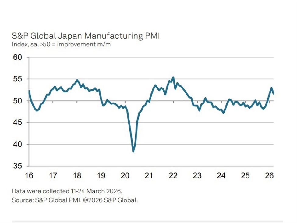 Business confidence weakened amid Middle East war uncertaintyJapan’s manufacturing sector continued to expand in March, though momentum slowed notably as rising costs and global uncertainty began to weigh on activity.The S&P Global Manufacturing PMI eased to 51.6 from 53.0 in February, indicating a slower but still solid pace of improvement. Despite the moderation, the reading remains among the strongest seen since mid-2022, suggesting the sector retains a degree of underlying resilience. The loss of momentum was evident across key components. Growth in output and new orders continued but at a more modest pace, reflecting softer demand conditions. Firms cited continued strength in areas such as semiconductors, AI-related products and automotive demand, though the overall expansion in new business slowed compared to recent months. Export orders also rose, but at a reduced rate.Employment increased for a third consecutive month, but hiring growth also moderated. While firms continued to expand capacity, labour shortages persisted and hiring was not sufficient to prevent a further buildup in backlogs of work.At the same time, cost pressures intensified. Input prices rose at the fastest pace in over a year-and-a-half, driven by higher energy and raw material costs, as well as the impact of a weaker yen. Survey respondents explicitly linked part of the increase to the Middle East conflict, which has disrupted energy markets and supply chains.Firms responded by raising output prices, with selling price inflation accelerating to one of the fastest rates in recent months, indicating ongoing pass-through of higher costs.Business confidence weakened compared to February’s recent highs, as companies expressed concern over the global outlook and the persistence of geopolitical risks. While some firms remain optimistic about demand tied to structural growth areas such as AI and defence, the near-term outlook has become more uncertain.Overall, the data suggest Japan’s manufacturing sector remains in expansion but is increasingly facing headwinds from rising costs and slowing demand, complicating the policy backdrop for the Bank of Japan.
