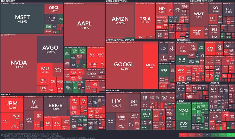 Today’s stock market revealed a turbulent yet dynamic trading environment, as the tech sector faltered while energy stocks outperformed. The trading landscape was riddled with red, except for a few bright spots in specific sectors, reflecting broader market uncertainty.📉 Technology and Semiconductor StrugglesSemiconductors: The semiconductor sector is experiencing considerable pressure. Key players such as Nvidia (NVDA) and Micron Technology (MU) have dipped by 1.47% and 4.13%, respectively. This downturn suggests caution among investors, possibly influenced by recent geopolitical tensions and supply chain concerns.Tech Giants: Major firms like Apple (AAPL) and Google (GOOGL) have seen their stocks decline by 1.46% and 1.75%. Such drops may signal profit-taking amid uncertainties in tech valuations.⚡ Energy Sector GainsOil and Gas: Amid broader market declines, the energy sector, led by ExxonMobil (XOM) with a gain of 1.14%, displayed resilience. This growth aligns with rising oil prices, indicating optimism within the sector as global energy demands increase.🏦 Mixed Signals in FinancialsDespite the overall negative performance, the financial sector showed mixed outcomes. JPMorgan Chase (JPM) dropped 3.05%, while other institutions like Visa (V) and Mastercard (MA) had minor declines of 1.03% and 0.93% respectively. This reflects uncertain economic forecasts impacting investor confidence.🔍 Market Mood and TrendsThe overall sentiment today leaned bearish, characterized by investor caution and a retreat from high-growth and tech stocks. Factors contributing to this mood include ongoing inflationary pressures and interest rate considerations, along with investor reactions to recent earnings reports.Conversely, the energy sector’s positive performance highlights a potential pivot in investor priorities towards sectors with less vulnerability to current geopolitical and economic stresses.🛡️ Strategic RecommendationsInvestors should consider favoring stability and growth potential in their portfolios by increasing exposure to robust sectors like energy and healthcare. Though tech and semiconductors present short-term challenges, they remain long-term growth candidates; thus, selective engagement may be wise.As the market weathers volatility, diversification remains key. Monitoring upcoming economic data releases and earnings reports will be crucial in anticipating market shifts. Keeping tuned to real-time updates is vital for exploiting new opportunities as they arise.For further insights and strategies, stay connected with InvestingLive.com for comprehensive coverage of market moving developments. 📊📰