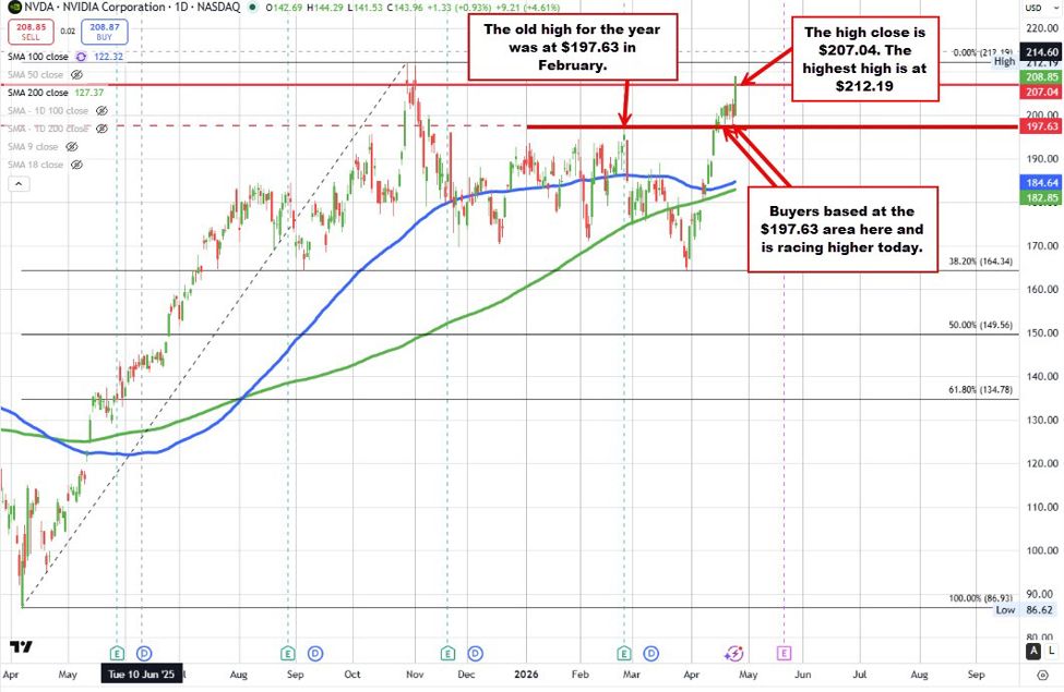 Shares of Nvidia have just spiked up to a high of $208.88. That took the price up by over $9 or 4.5% on the day. The price also moved above its all-time high closing level going back to October 29 at $207.04.Since March 30 with the market closing at its low at $165.17.Total trading days: ~18
