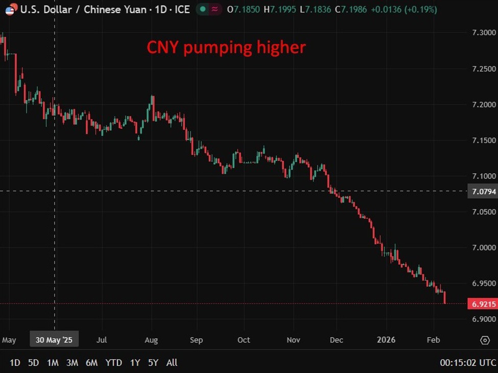 The People’s Bank of China is still letting the CNY climb higher. Along with this news I think this is all very significant:ICYMI bombshell: China tells banks to curb US Treasury exposure, “sell-America” nervesAs Trump fumbles the ball, China is picking it up and running hard with it. —The People’s Bank of China is due to set the daily USD/CNY reference rate at around 0115 GMT (2115 US Eastern time), a fixing that remains one of the most closely watched signals in Asian foreign exchange markets. China operates a managed floating exchange rate system, under which the renminbi (yuan) is allowed to trade within a prescribed band around a central reference rate, or midpoint, set each trading day by the PBOC. The current trading band permits the currency to move plus or minus 2% from the official midpoint during onshore trading hours. Each morning, the PBOC determines the midpoint based on a range of inputs. These include the previous day’s closing price, movements in major currencies, particularly the US dollar, broader international FX conditions, and domestic economic considerations such as capital flows, growth momentum and financial stability objectives. The midpoint is not a purely mechanical calculation, allowing policymakers discretion to guide market expectations. Once the midpoint is announced, onshore USD/CNY is free to trade within the allowable band. If market pressures push the yuan toward either edge of that range, the central bank may step in to smooth volatility. Intervention can take the form of direct buying or selling of yuan, adjustments to liquidity conditions, or guidance through state-owned banks. As a result, the daily fixing is often interpreted as a policy signal rather than just a technical reference point. A stronger-than-expected CNY midpoint is typically read as a sign the PBOC is leaning against depreciation pressure, while a weaker fixing for the CNY can indicate tolerance for a softer currency, often in response to dollar strength or domestic economic headwinds.In periods of heightened global volatility, such as shifts in US rate expectations, trade tensions or capital flow pressures, the fixing takes on added significance. For investors, it provides insight into Beijing’s currency priorities, balancing competitiveness, capital stability and financial market confidence.