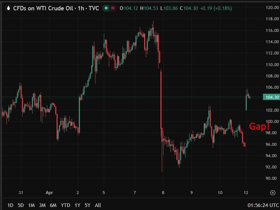 You can check out market charts free here: Live ChartsIn a nutshell, oil is not even approaching its gap, but FX and equities are faring a little (a very little) better. The news:the collapse of recent US–Iran talksUS Navy would implement a blockade targeting vessels interacting with Iranian ports, focusing on Iranian-linked trade while preserving freedom of navigation for vessels travelling to and from non-Iranian ports through Hormuz.