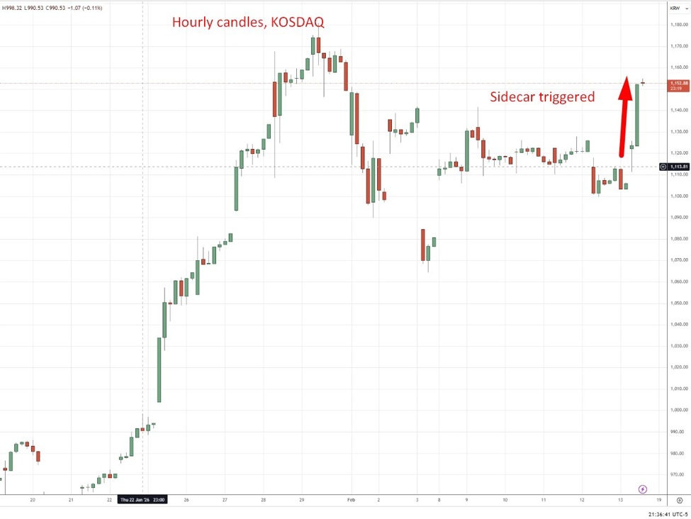 Korean stocks hit a record high on tech strength, with a Kosdaq sidecar briefly triggered.Summary:KOSPI surged 2.46% to a record 5,642, breaking above 5,600 for the first timeTech stocks led gains, with Samsung Electronics up 4.0%Kosdaq programme trading was briefly halted after sidecar activationForeign investors were net sellers despite the rallyWon weakened while benchmark bond yields fellSouth Korean shares rallied to a fresh record high on Thursday, with the benchmark KOSPI rising 2.46% to 5,642.37, surpassing the 5,600 mark for the first time. The advance came as markets reopened following a three-day holiday break, with investor sentiment lifted by a strong rebound in US technology stocks overnight.Heavyweight semiconductor names drove the gains. Samsung Electronics jumped 4.03%, while SK Hynix added 1.48%, reflecting renewed optimism in the global chip cycle. Battery maker LG Energy Solution rose 1.77%, while industrial and auto names also participated in the rally. Hyundai Motor gained 0.40% and Kia climbed 2.32%, while POSCO Holdings advanced nearly 4%. Market breadth was positive, with 583 of 927 traded issues rising.The rally was strong enough to trigger a volatility control mechanism in the junior Kosdaq market. Programme trading was halted for five minutes after the Kosdaq 150 futures contract surged 6%, activating the Korea Exchange’s “sidecar” rule.Sidebar: What is the Korea sidecar rule?