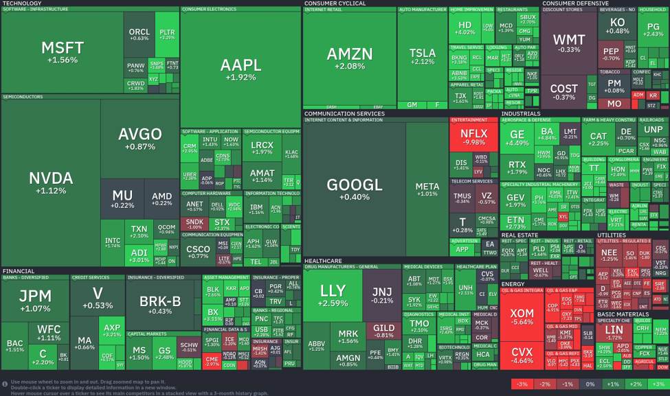 Tech stocks are on the rise, and here’s why that matters for traders right now: Microsoft’s 1.56% gain signals a broader bullish sentiment in the tech sector, particularly in software infrastructure. This uptick could be a precursor to further rallies, especially with Nvidia also leading the charge. Traders should keep an eye on key resistance levels in these stocks, as a breakout could trigger momentum buying. Conversely, the energy sector’s decline is noteworthy; it suggests a rotation out of energy stocks, which could impact related assets like oil futures. If energy continues to falter, it might create opportunities in tech as capital flows shift. Watch for any news that could further influence these sectors, especially earnings reports or macroeconomic indicators that could sway investor sentiment. The next few trading sessions will be crucial to see if tech can maintain this momentum or if profit-taking sets in, particularly as we approach the end of the month. Keep an eye on the daily charts for MSFT and NVDA; a close above recent highs could signal a strong continuation pattern.