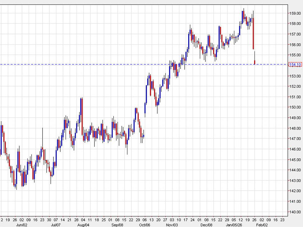 USD/JPY is down 167 pips to the lows of the day.It’s been volatile trading so far today as the pair initially traded near these levels befoer bouncing by more than 100 pips. In the past two hours though, it began trending lower and has now taken out the lows.The drop today takes the pair through a December double bottom near 154.30 and that highlights the possibility of a trend change. If you zoom out, the reversals in this pair, particularly the ones lower lately have been big and aggressive. The July 2024 reversal is instructive as it also started near 160 and continued down to 141 less than a month later.That move was kicked off by actual intervention from Japanese officials.So far we haven’t seen that, but just now Japan’s chief cabinet secretary said they are closely watching market moves with a high sense of urgency. Kihara also said they will take appropriate action based on the Sept j int statement with US officials. That statement wasn’t overly notable at the time but in it, the United States and Japan reaffirmed their commitment to “market determined” exchange rates.He declined to comment about JGB moves are reports of a rate check.The latest move lower in USD/JPY is part of a larger selloff in the US dollar but the moves are particularly large in USD/JPY, likely reflecting the crowded nature of long bets in that pair. Over in the precious metals market, gold and silver are making historical moves as the market seemingly loses confidence in USD reserves.Amidst all this, the bond market is relatively stable. Should it come unmoored, the volatility could spill into equities and cause some larger problems. Odds of another US government shutdown are currently spiking and that won’t be welcomed by any equity market but the yen would be an FX winner if it means risk off and USD selling.